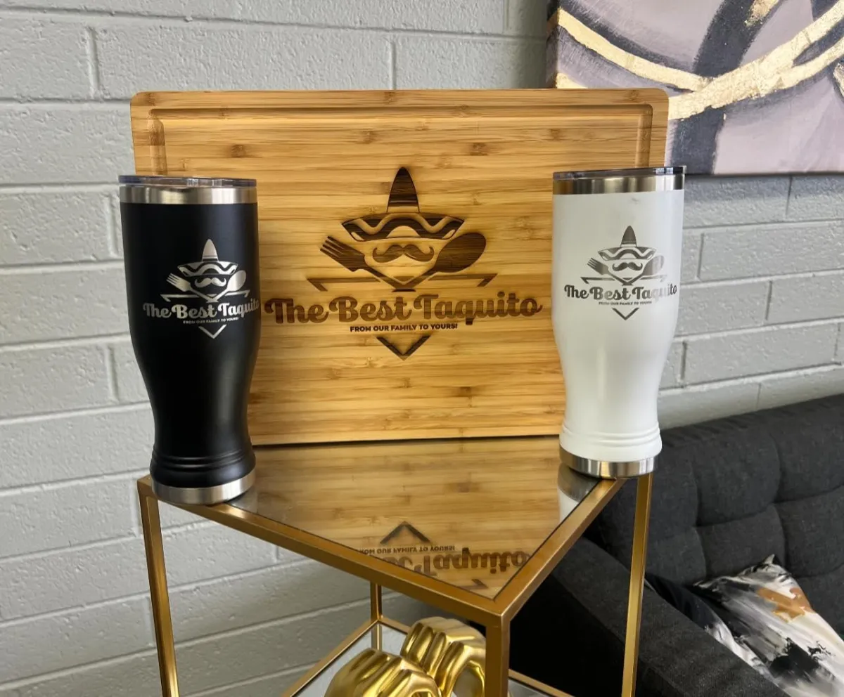 We bring your ideas to life on a wide range of materials—including glass, wood, leather, acrylic, aluminum, crystal, stainless steel, bricks, slate, coated brass. Whether it’s a custom tumbler, cutting board, or an elegant glass award, we make sure your message shines.